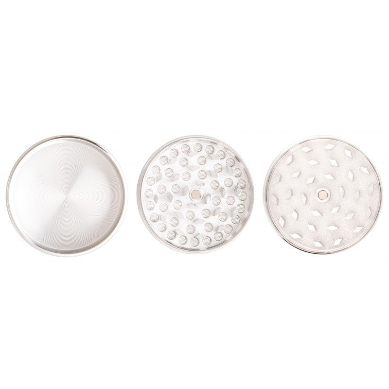Le grinder en 3 parties permet de broyer efficacement et de récolter le pollen. Ce grinder métal chromé possède des dents permettant de broyer convenablement le tabac et les herbes pour en retirer l’essentiel.